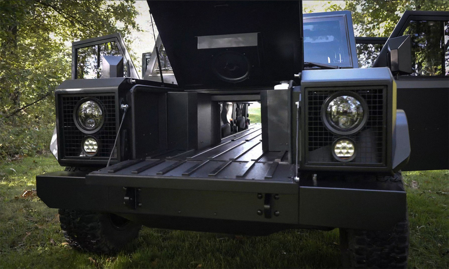 Ngoài Passthrough, Bollinger đã có được một bằng sáng chế khác để thiết kế Frunkgate, đây là loại mở của nắp trước của đường hầm Passthrough. Frunkgate mở ra giống như mui xe ở vị trí lưới tản nhiệt. Có bốn ổ cắm 110 V trong không gian bên trong, có thể giúp người dùng sạc các thiết bị như máy nén hoặc các thiết bị điện khác. Xe điện B1. Ảnh: Bollinger