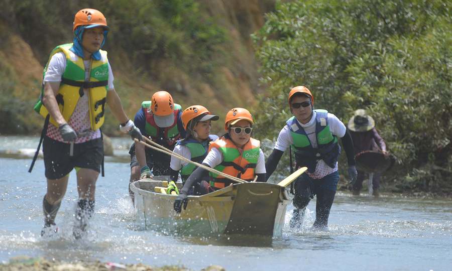 Đội đang lái xe ngược dòng sông Rao Nan 14 km. Ảnh: Hoàng Tao